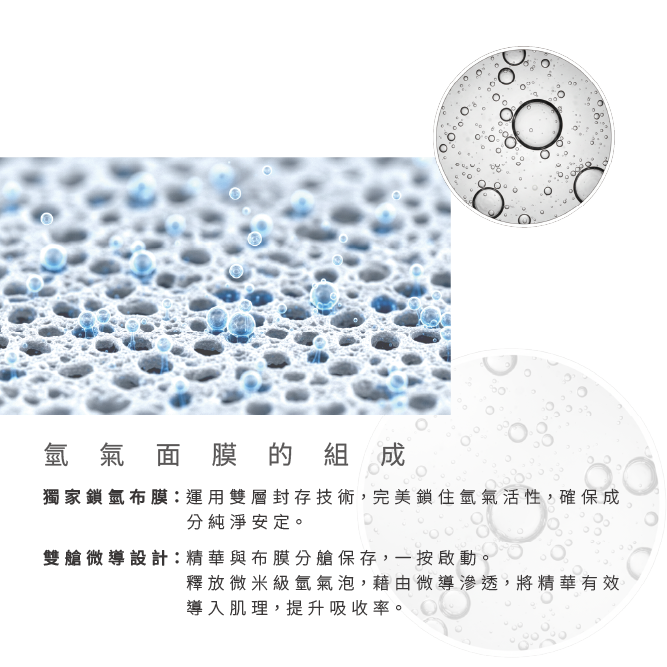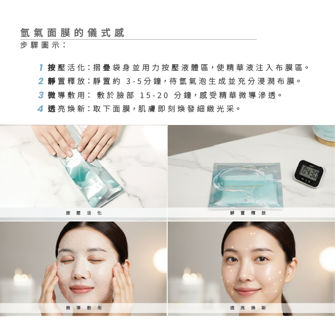 특허받은 고체 수소 캡슐화 기술을 활용하여, 마스크 안에 수소가 안정적으로 보존되며 에센스를 흡수할 때 방출되어 흡수를 도와줍니다. 브라이트닝 에센스와 함께 사용하면 단 15분 케어로 피부를 리프레시하고, 칙칙함을 개선하며 맑고 빛나는 피부로 가꿔줍니다.